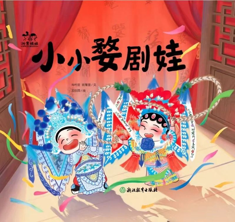 该作品源自《小小婺剧娃》绘本,其创作始于吕耀坚副教授的一次实践调研。在东阳市第三实验幼儿园,孩子们浸润婺剧文化的场景,让他萌生“以绘本传扬浙派文化”的想法,并与园方合作完成文稿。自幼热爱绘画的王佳同主动请缨,凭借童真灵动的插画风格加入团队,开启创作之路。