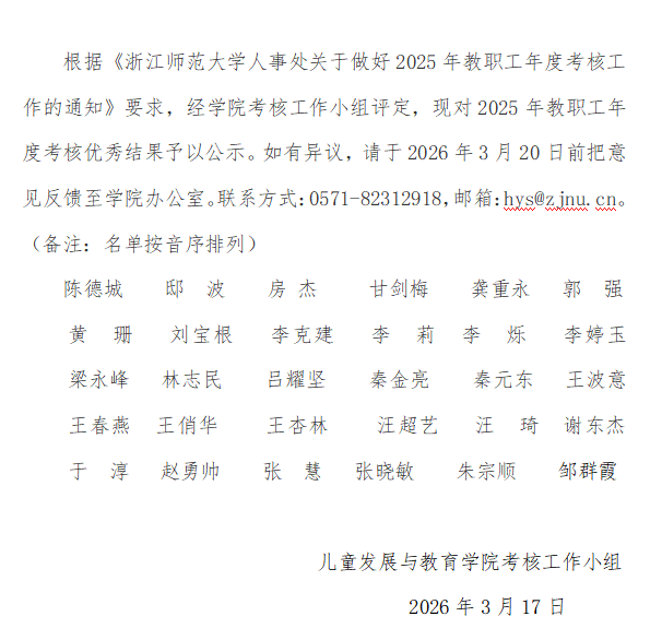 学院教职工2025年度考核优秀人员名单公示